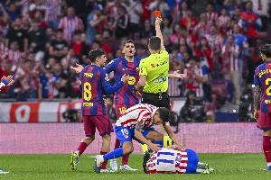 VAR两次介入成为转折点:第一次将尼古拉斯・冈萨雷斯的第二张黄牌改判为直接红牌,对比赛影响有限。第二次则在下半场初段引爆争议:巴萨球员赫拉德・马丁拼抢时先触到球,但随后踩到了阿尔马达的脚踝。主裁布斯克茨・费雷尔最初认定这是严重犯规,直接出示红牌。但VAR裁判梅莱罗・洛佩斯持相反意见,示意主裁回看录像改判。