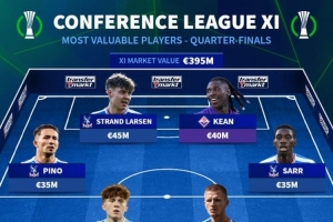 德转公布欧协联1/4决赛身价最高十一人:水晶宫独占九席